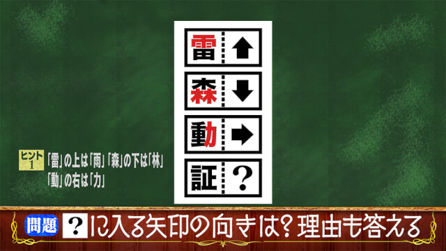 矢印と漢字を組み合わせると熟語になります。まずは雷を見てみましょう。雷+雨で雷雨となります。