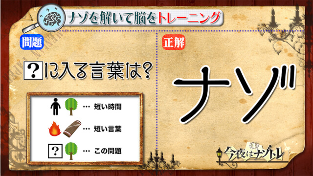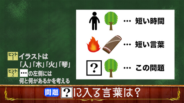 それぞれの絵を文字にすると「ひと と き」「ひ と こと」となります。同じように考えると「? と き」となり、この問題は「謎解き」ですので?には「なぞ」が入ります。